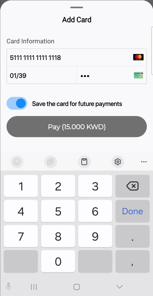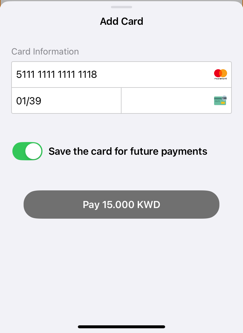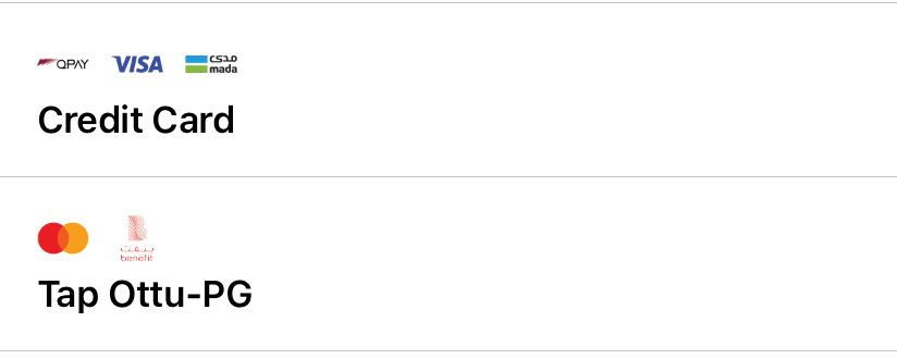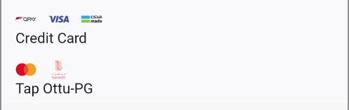 applePay: The Apple Pay payment method is supported, allowing purchases to be made using Apple Pay-enabled devices.cardOnsite: A direct (onsite) payment method, where customers are required to enter their card details directly within the SDK.tokenPay: A method utilizing tokenization, ensuring that customer payment information is securely stored and processed.redirect: A payment method where customers are redirected to an external payment gateway or a third-party processor to complete the transaction.stcPay: A method where customers enter their mobile number and authenticate using an OTP sent to their mobile device.